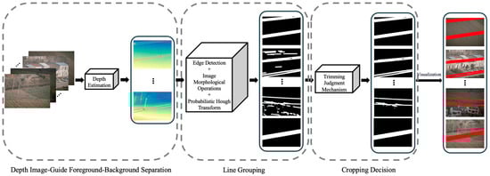 This paper proposes a wire region extraction method for transmission line images, with the overall processing pipeline illustrated in Figure 1. The method first performs depth estimation, where a depth estimation model is employed to generate a depth map from the original large-format images, thereby enhancing the distinction between the foreground (wires) and the background. Subsequently, edge detection and morphological operations are applied to achieve effective line-segment grouping. Finally, a cropping decision mechanism is employed to eliminate non-wire structures from the valid line-segment groups, ultimately enabling precise extraction of the wire regions.
