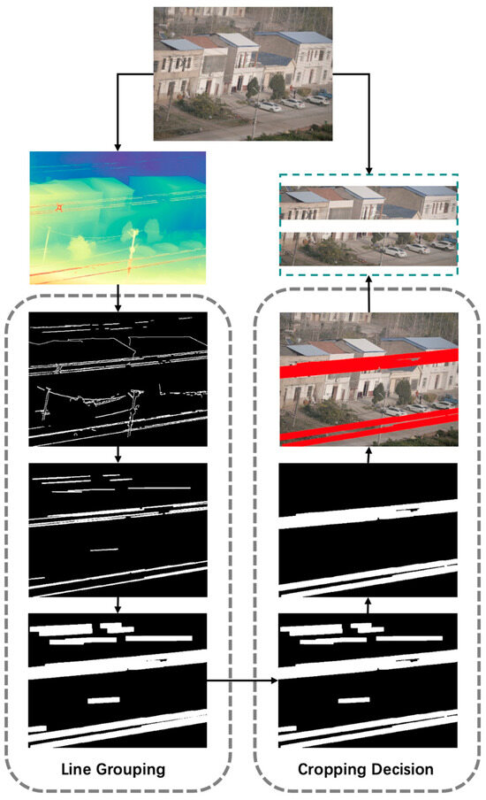 In practical scenarios, wires in large-format images of transmission line corridors typically exhibit certain geometric and linear shape distribution characteristics, such as a consistent angular tilt, spanning roughly across the left and right sides of the image, similar angles, and considerable length. However, the images often contain numerous linear interfering elements, such as utility poles and rooftop edges, which pose significant challenges to accurate wire extraction. To address this, this paper proposes a wire region identification mechanism that combines line segment structural analysis with rule-based judgment to efficiently generate precise cropping regions. This mechanism consists of two key steps, namely line grouping and cropping decision. The visualization flowchart of the proposed method is shown in Figure 3.