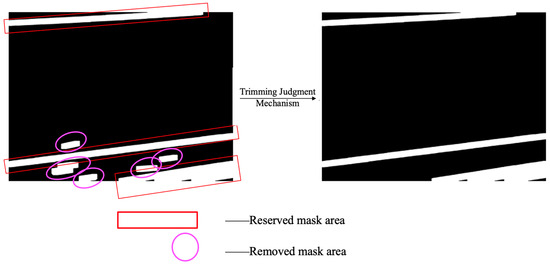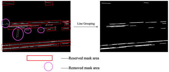 In practical applications, only areas that meet the requirements of (1) simultaneously contacting the left and right boundaries, (2) simultaneously contacting the left and upper boundaries, and (3) simultaneously contacting the lower and right boundaries are considered effective wire areas. Record all connected regions that meet the judgment rule as . The effectiveness of the judgment mechanism is illustrated in Figure 5. In the left image, the line-segment masks enclosed within the red rectangular boxes represent those that meet the criteria and are retained after the cropping judgment mechanism. In contrast, the line-segment masks enclosed within the elliptical boxes do not satisfy the cropping judgment mechanism and are therefore removed.