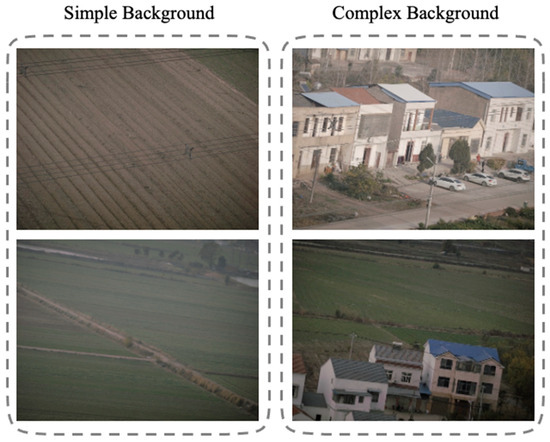 The experiments were conducted on a Linux-based Ubuntu 20.04.4 LTS operating system using an NVIDIA Tesla P100 GPU. All experiments were performed on three datasets. Firstly, two categories of images are defined according to the background complexity: (1) simple-background images (with a background consisting of a single sky or a single ground surface), and (2) complex-background images (with backgrounds containing numerous linear structures such as farmland or buildings), as shown in Figure 6. Here, the three datasets are referred to as Dataset A (short for DA), Dataset B (short for DB), and Dataset C (short for DC). Dataset A comprises 230 transmission line images, including 180 images containing wires (90 with simple backgrounds and 90 with complex backgrounds), and the remaining 50 images do not contain wires. Dataset B consists of 90 simple-background wire images and 50 wire-free images from Dataset A. Dataset C includes 90 complex-background wire images from Dataset A and the same 50 wire-free images. This setup facilitates the comparison of image recognition performance under different background conditions. The input image resolution is 12,768 × 9564 pixels, requiring no additional preprocessing. Quantitative evaluation metrics are described in Section 4.2.