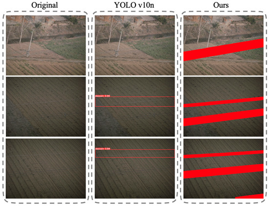 To provide a more intuitive demonstration of the effectiveness and superiority of the proposed method, visualization experiments were conducted. Figure 7 presents a comparative visualization between our method and YOLOv10n. As can be clearly observed, the proposed method surpasses the baseline in terms of detail preservation, boundary segmentation, and semantic consistency. In particular, under complex backgrounds, our method achieves more accurate localization of target regions, whereas YOLOv10n is more susceptible to background interference, leading to frequent missed detections.