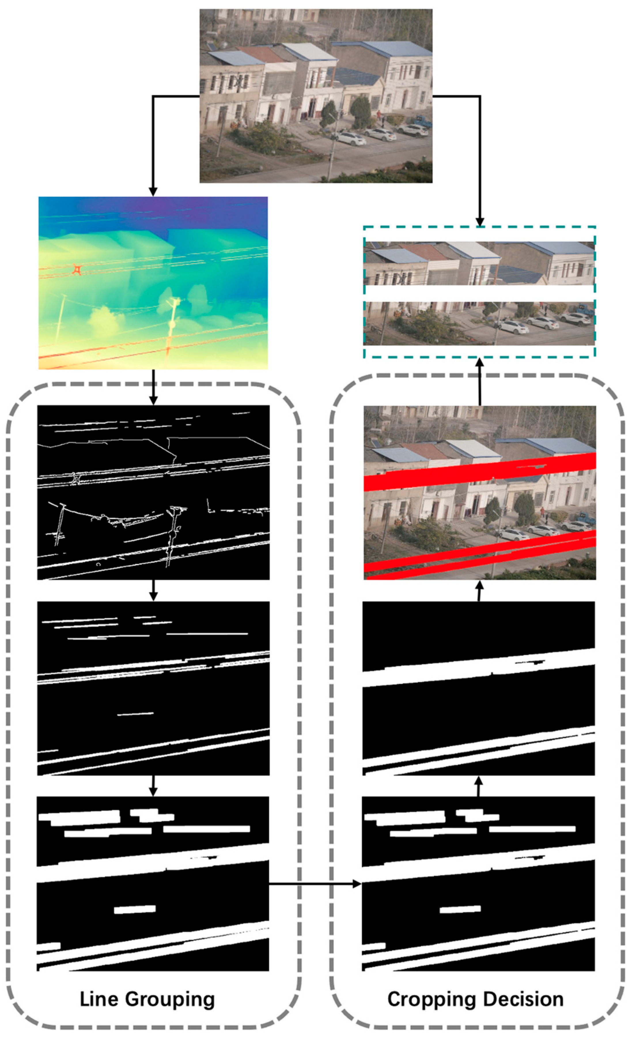 To address the aforementioned challenges, this paper proposes a training-free transmission wire extraction method specifically designed for large-format images with complex backgrounds. The method is based on computer vision techniques and consists of three main stages: (1) Single-image depth estimation is employed to enhance the structural perception of the image, thereby improving the visual separability between the foreground wires and the background; (2) Structural analysis techniques are used to extract elongated and continuous line segment candidates, and a line grouping strategy is applied to identify wire fragments; (3) Classical algorithms such as edge detection, morphological processing, and probabilistic Hough transform are integrated to accurately extract wire regions and eliminate redundant detections.