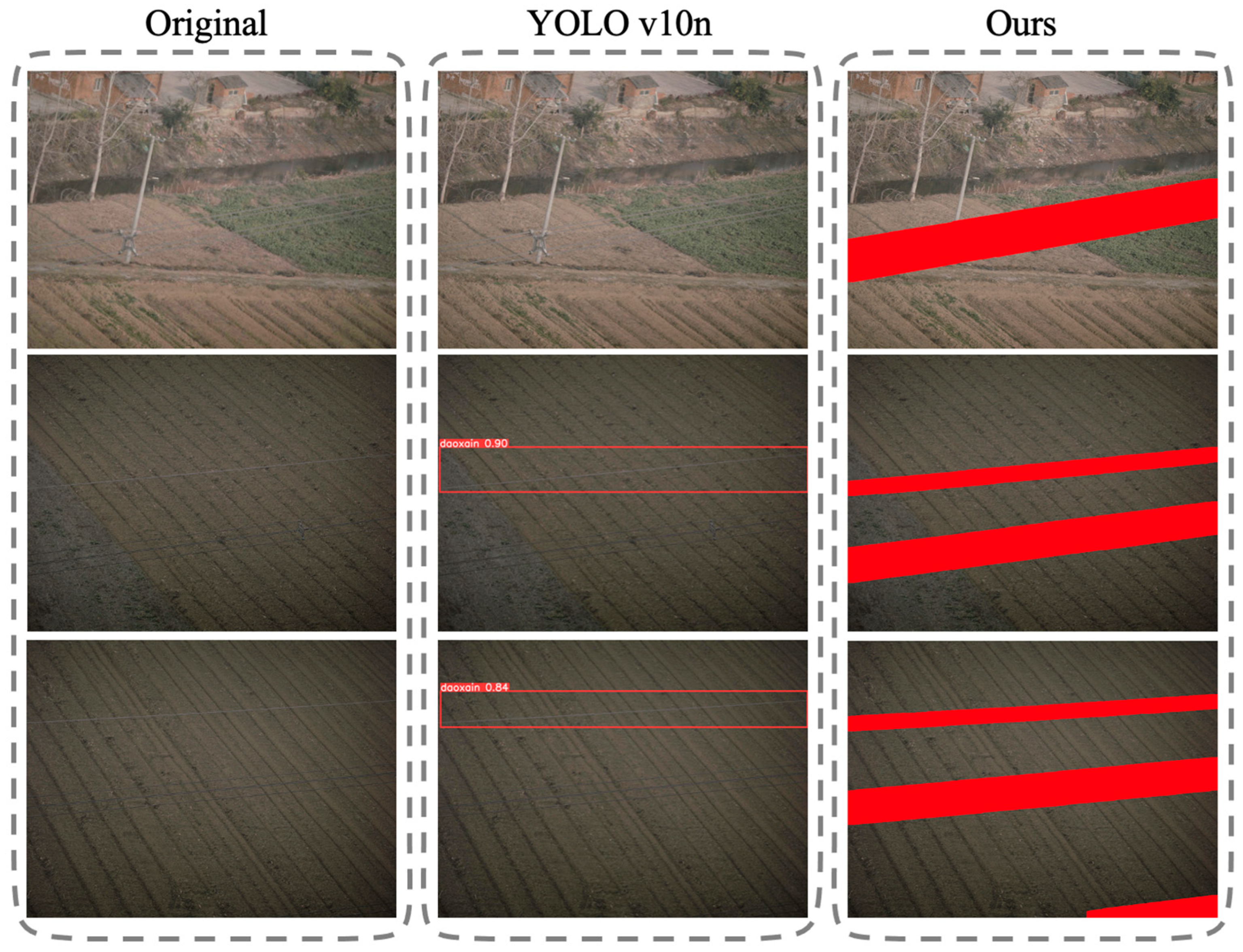 To validate the effectiveness of the proposed training-free wire extraction method for large-format images of transmission line spans, a series of comparative experiments were designed and conducted. The experimental procedure consisted of three main steps: First, the proposed method was applied to a designated validation dataset to extract wires, and relevant performance metrics were recorded. Second, standard object detection models (e.g., YOLO variants) and conventional image processing methods were applied to the same dataset for wire detection, and their performance metrics were documented. Finally, a comparative analysis of the metrics across the three approaches was conducted. The results demonstrate that the proposed method outperforms both deep learning and traditional approaches across multiple metrics, confirming its robustness and accuracy in handling complex backgrounds. This underscores its high practical value and potential for supporting defect detection tasks in transmission line span images.