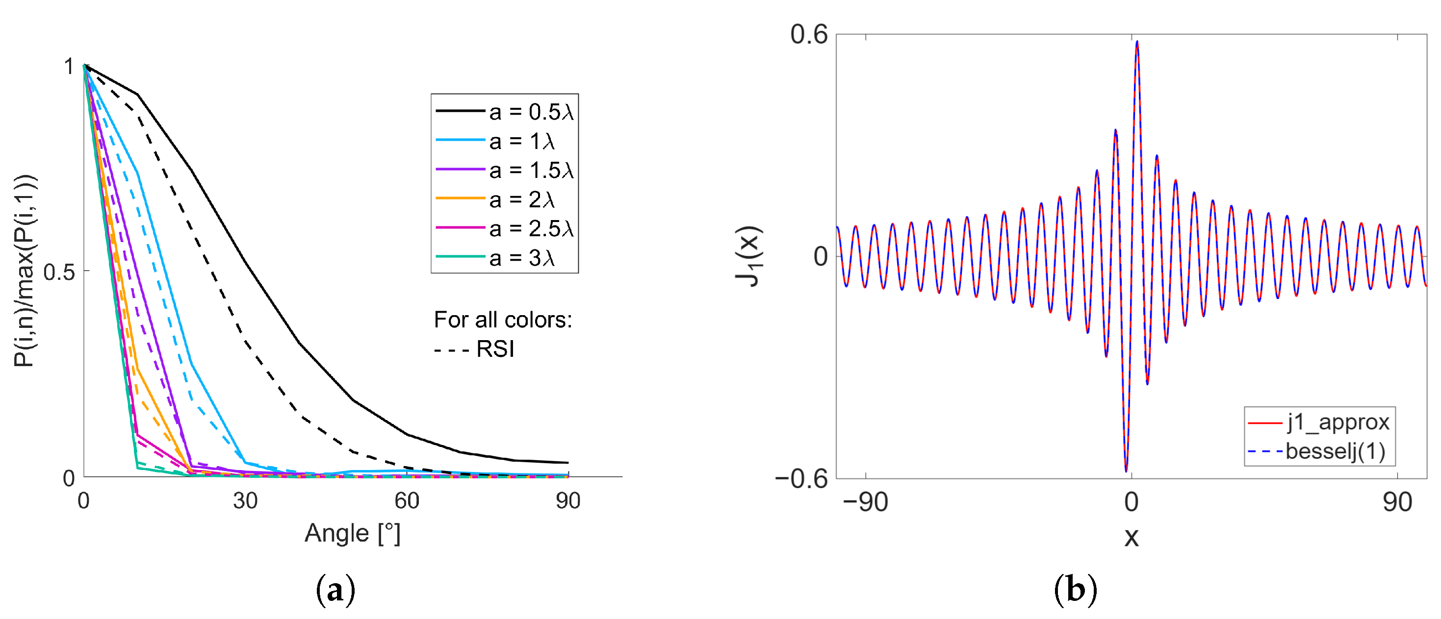 - Element directivity, which is modeled with a Bessel-based scalingwhere is the first-order Bessel function and is the element width relative to the center wavelength, so