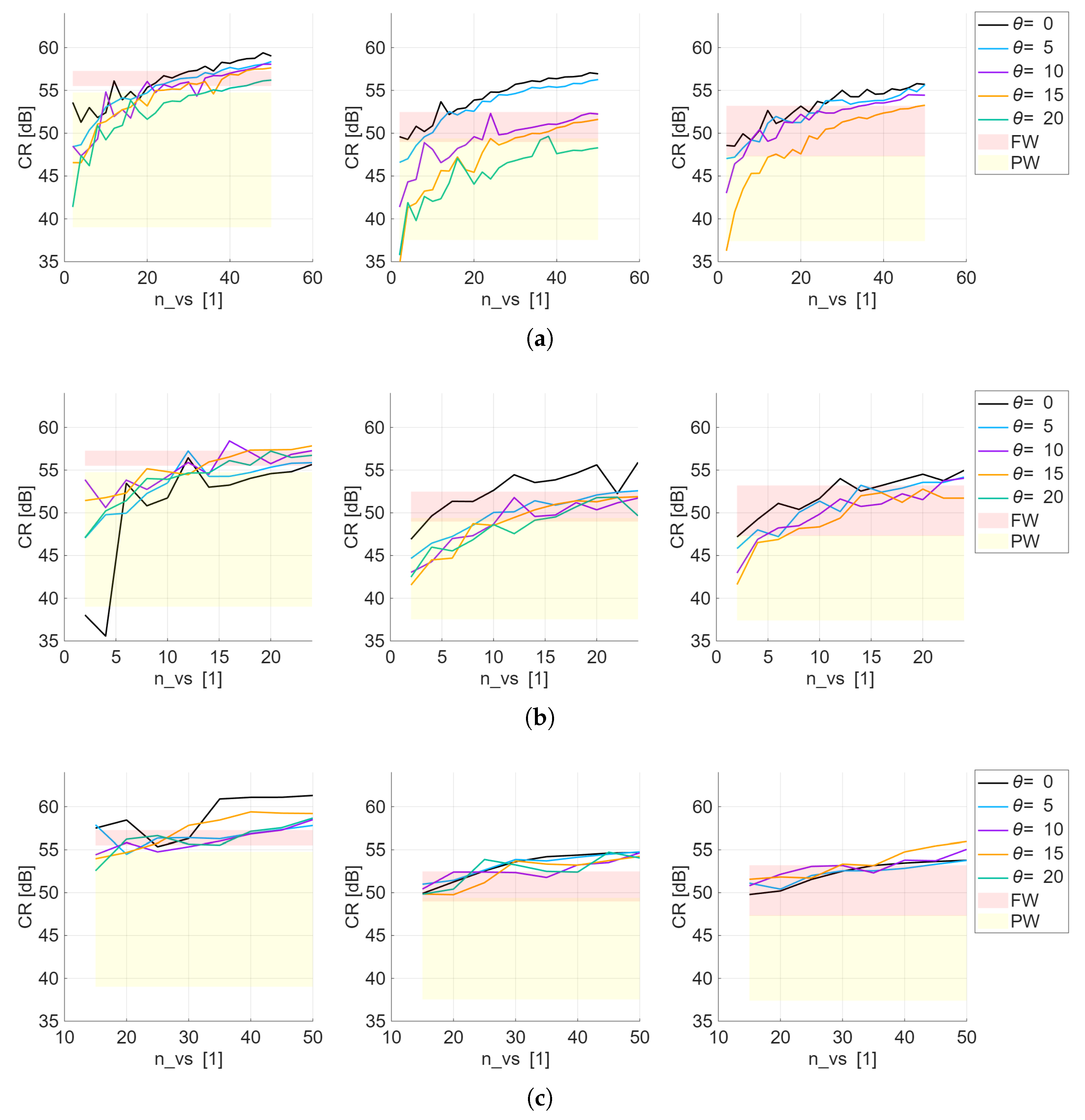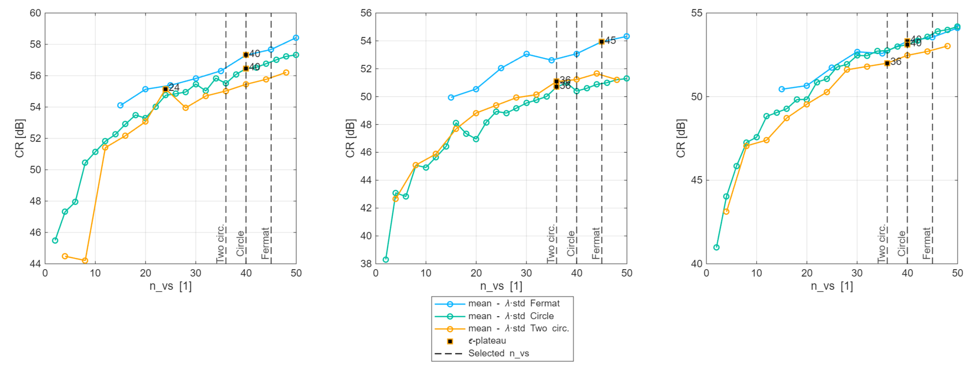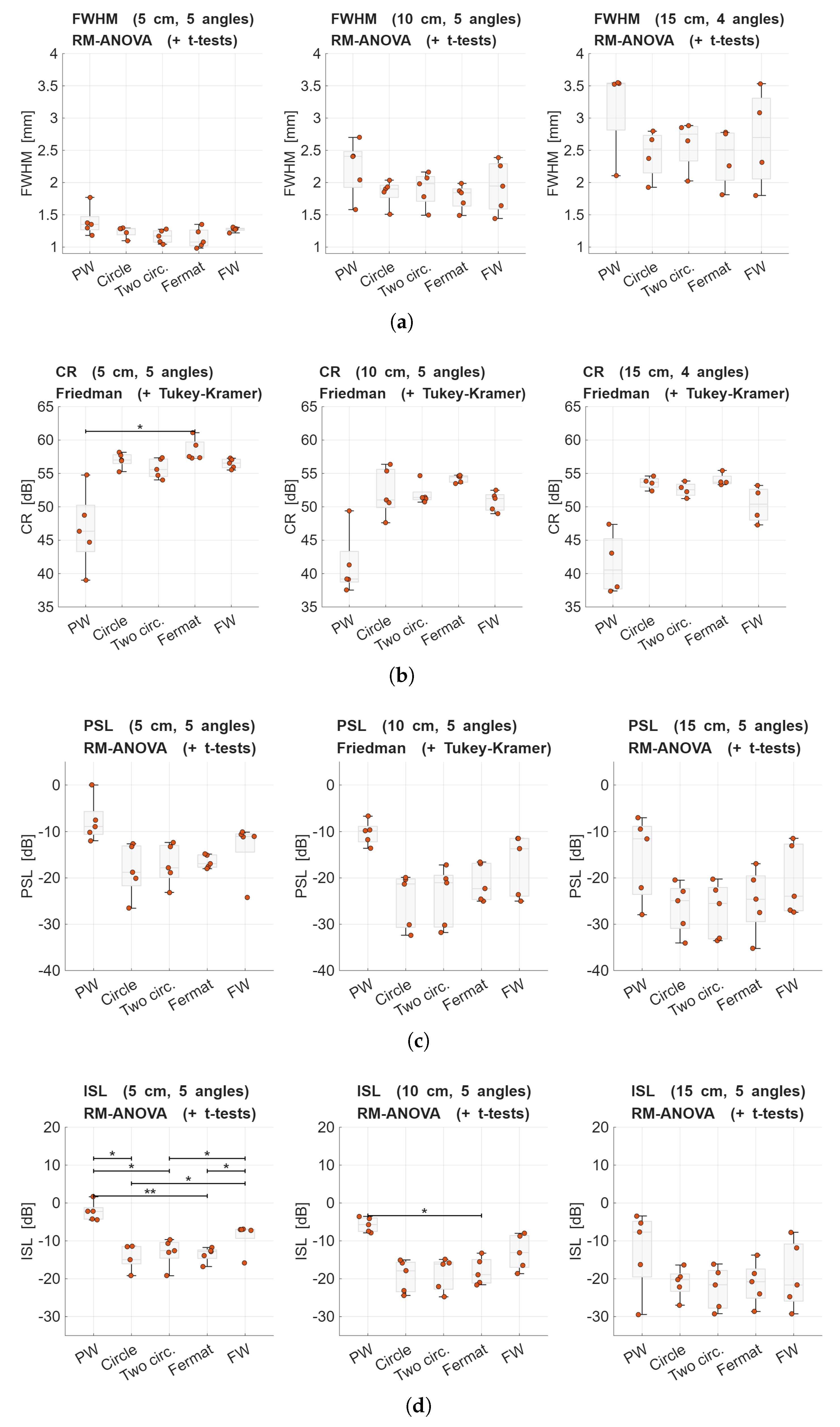 - CR: Ratio of the average envelope amplitude in a volume of interest to the average envelope amplitude of the background. The volume of interest was defined as a cube of dimensions given by the FWHM, centered at the known scatterer position. The remaining reconstruction volume was set as background. CR is used to estimate the visibility of the targeted structure and is expected to be maximized for improved detectability.