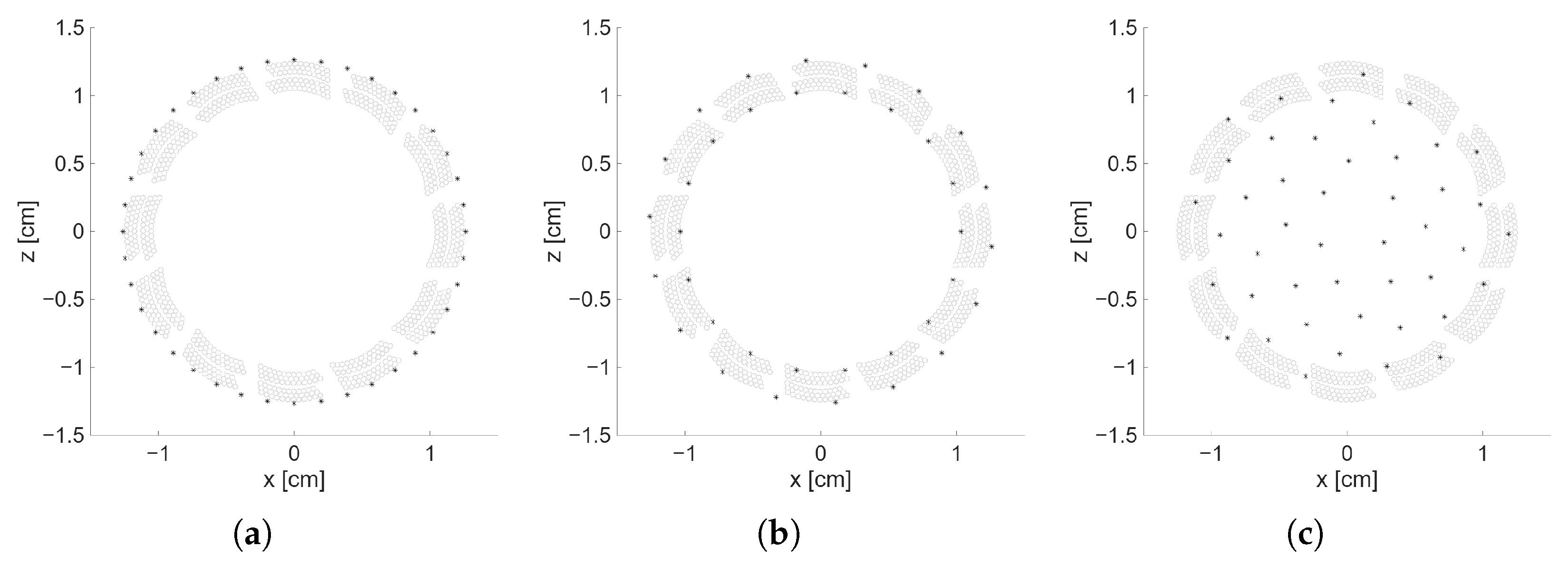 - Diarra, B.; Robini, M.; Tortoli, P.; Cachard, C.; Liebgott, H. Design of Optimal 2-D Nongrid Sparse Arrays for Medical Ultrasound. IEEE Trans. Biomed. Eng. 2013, 60, 3093–3102. [Google Scholar] [CrossRef] [PubMed]