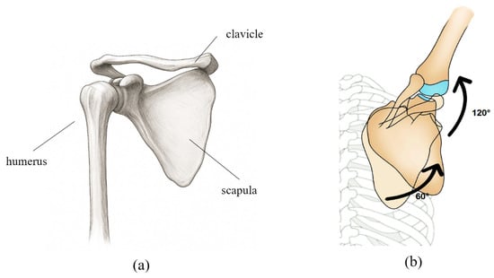 For effective shoulder joint rehabilitation, it is essential to understand and replicate the biomechanical movements of the shoulder complex. Figure 1a illustrates the anatomical structure of the shoulder girdle, which enables complex, coordinated movements among multiple joints. The shoulder motion involves rotation of the humerus accompanied by simultaneous movements of the scapula and clavicle, resulting in a shifting center of rotation. This coordinated movement is described by the scapulohumeral rhythm. As shown in Figure 1b, during 180° of arm abduction, the humerus and scapula move in a ratio of approximately 2:1 (120° and 60°, respectively), with simultaneous upward rotation of the scapula [22].