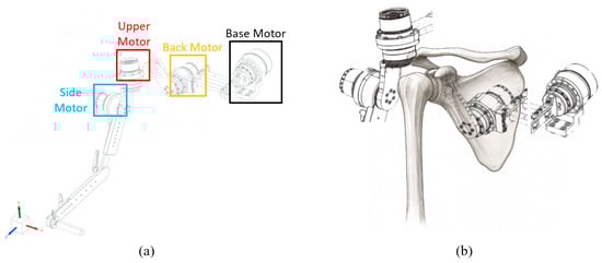 The robot designed according to this configuration is shown in Figure 2. To reproduce the scapulohumeral rhythm, the motion of each anatomical segment was actuated by four motors. As illustrated in Figure 2, the Base Motor, Back Motor, Upper Motor, and Side Motor were configured to enable coordinated replication of complex shoulder movements.