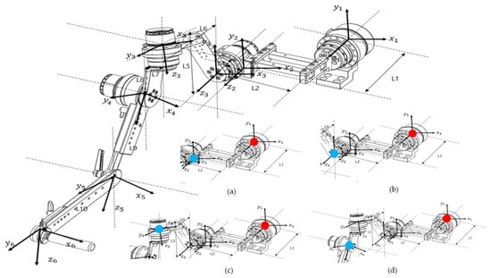 Diagram showing the coordinate axes for each motor based on Euler angles for kinematic analysis, as indicated on the design drawing. The diagram at the bottom right shows the calculation of the end effector position for each part from each reference point. (a) Base Motor–Link2, (b) Base Motor–Back Motor, (c) Base Motor–Upper Motor, and (d) Base Motor–Side Motor (red dots indicate reference points and blue dots indicate end effectors).