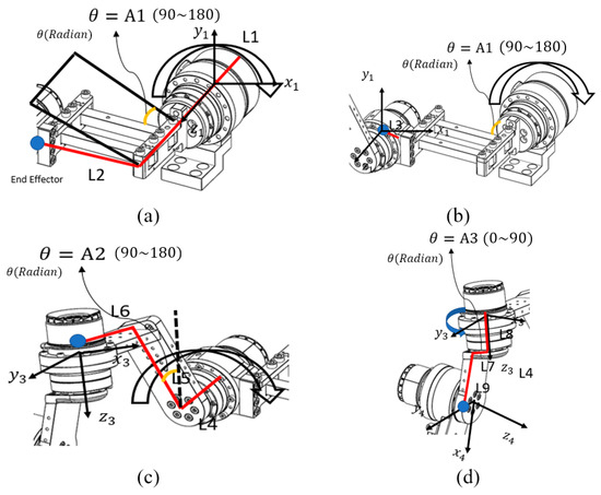 Coordinate axis analysis for each motor: (a) Base Motor–Link 2, (b) Link 2–Back Motor, (c) Back Motor–Upper Motor, and (d) Upper Motor–Side Motor. Each part represents the divided end-effector calculation for the corresponding motor segment. The red lines indicate the links used in the coordinate calculation, while the blue dots represent the end-effector positions of each segment.