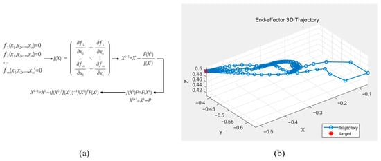 To verify the forward kinematics, inverse kinematic calculations were performed using the Gauss–Newton method, which is commonly employed to approximate solutions to systems of nonlinear equations. The Gauss–Newton algorithm estimates model parameters by solving a nonlinear least-squares problem, as illustrated in Figure 5. Using this method, the joint angles required for the robot’s end effector to reach a desired position within a specified number of iterations were determined. The Gauss–Newton method was implemented in MATLAB, and the computed results confirmed that the derived equations accurately produced the joint angles corresponding to the target positions.