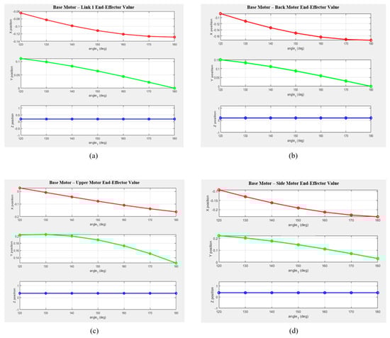 Variations in the end-effector position along the x-, y-, and z-axes for each drive motor configuration when the base motor angle changes from 10° to 60°: (a) from the Base Motor to Link 1; (b) from the Base Motor to the Back Motor; (c) from the Base Motor to the Upper Motor; and (d) from the Base Motor to the Side Motor.