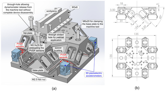 Figure 1. (a) Partially exploded view of the new device where the main elements are visible, including the PVDF sensors and accelerometers. (b) Main dimensions of the upper platform.