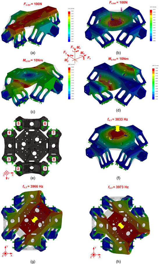 Figure 2. FEM analysis of the device to assess its static and dynamic behavior. Bottom view of the meshed component showing all PVDF contact surfaces, numbered from 1 to 8 (e), which are assumed to be perfectly clamped in all simulations. Results of static simulations under different loading conditions: transverse force (a), axial force (b), torsional moment (c), and bending moment around a horizontal axis (d). First three dominant vibration modes (fh).