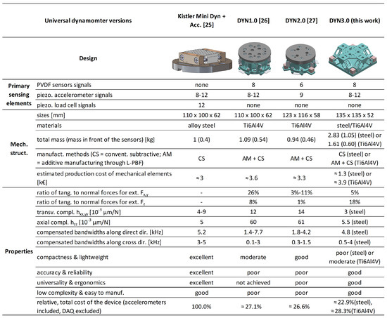 Figure 3. Comparison among the reference universal (piezoelectric) dynamometer developed in [25] and other recently developed three-dimensional dynamometers based on the PVDF technology, included the second prototype developed by Bordon in [27].