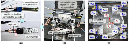 Figure 4. (a) Details of PVDF electrical insulation and connections, to minimize the noise. (b) Pre-load phase of the PVDF sensors using a calibrated wrench. (c) Accelerometers configuration.