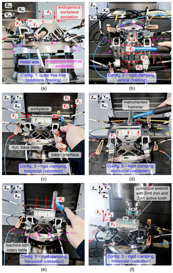 Figure 5. (a) Quasi free–free configuration used for training: the device is fixed to the rotary table of the machine tool using only modal wax. (b) Rigid clamping of the device on the rotary table, vertically oriented (rotations A and B both 90 ° ), also used for training. (ce) Modal analysis in the validation configuration: the device is rigidly clamped on the rotary table, horizontally oriented (rotations A and B both 0 ° ), and impulsive forces are applied along X, Y, and Z directions, respectively. In all cases, both endogenous and exogenous pulse testing is carried out. (f) Experimental setup for cutting tests, performed in the final validation configuration.