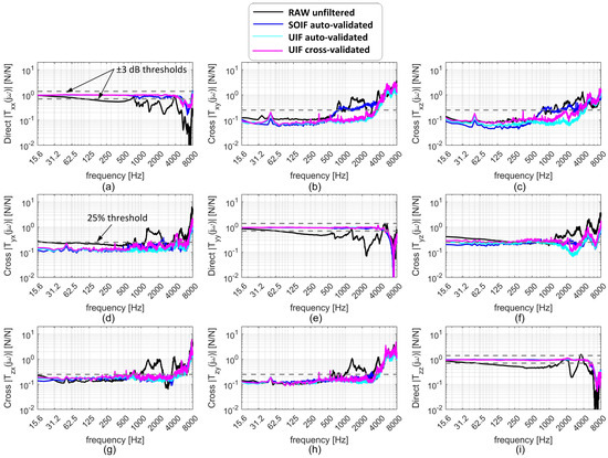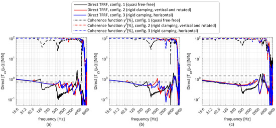 Direct transmissibilities obtained at the three different configurations are illustrated in Figure 6. While configuration 1 (free-free) is radically different from configurations 2 and 3 along all directions in the whole frequency range of interest, configurations 2 and 3 differ significantly at least along the X and Y directions in the range 0.5–4 kHz. This was considered sufficient to test the universality of the filter.