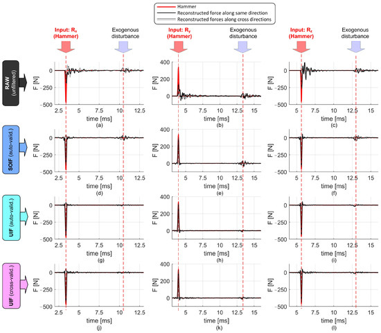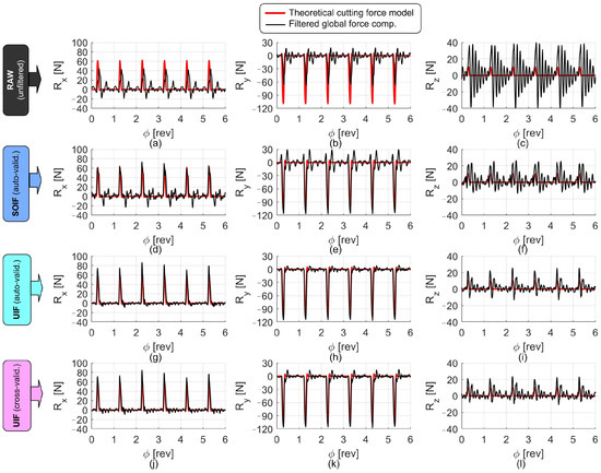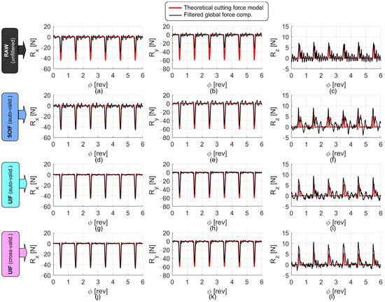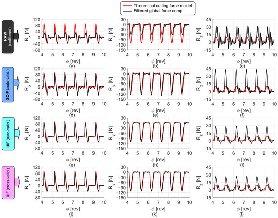 Figure 11. Comparison of the force components reconstructed using different filters during central milling of a thin-walled part. Nominal cutting parameters: n = 15,000 rpm, f z = 0.1 mm, a p = 1.2 mm, a L 1 = 1 mm, a L = 2 mm. Raw forces are shown in (ac). Forces reconstructed through SOIF are shown in (df). Forces derived from auto-validated UIF are illustrated in (gi), while those obtained from cross-validated UIF are reported in (jl).