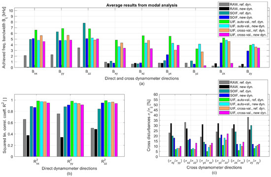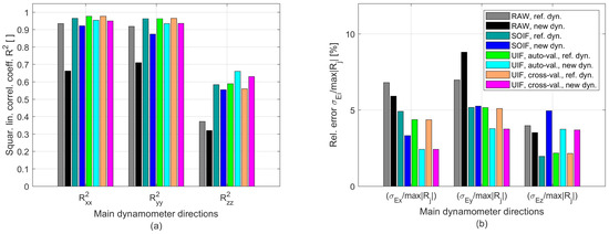 Figure 13. Comparison between the filtered cutting forces derived from real cutting tests, obtained from the novel device and the theoretical force model identified through the reference dynamometer in [25]. (a) Squared linear correlation coefficients between filtered force components and theoretical model. (b) Cross-talk disturbances normalized by the maximum force component.