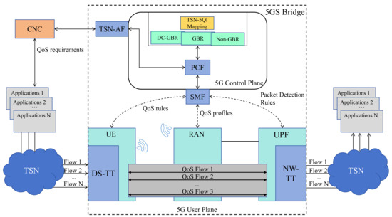 - Satka, Z.; Ashjaei, M.; Fotouhi, H.; Daneshtalab, M.; Sjödin, M.; Mubeen, S. QoS-MAN: A novel QoS mapping algorithm for TSN-5G flows. In Proceedings of the 2022 IEEE 28th International Conference on Embedded and Real-Time Computing Systems and Applications (RTCSA), Taipei, Taiwan, 23–25 August 2022; pp. 220–227. [Google Scholar]