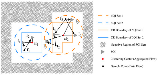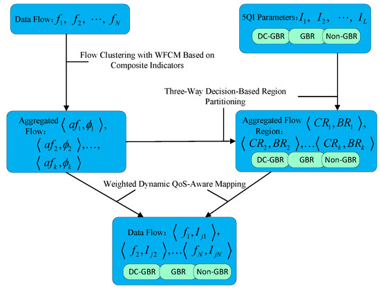 In a 5G–TSN converged network, the input consists of N TSN traffic flows, each described by D QoS attributes. The 5G system is pre-configured with L standardized 5QI entries, each also characterized by D QoS parameters. After flow clustering, the N TSN flows are grouped into C aggregated flow clusters. Each cluster is associated with a cluster center and a corresponding set of flows , where . Based on the cluster center of each aggregated flow, the set of L 5QIs is partitioned using a three-way decision mechanism. For each aggregated flow cluster, this results in two subsets of 5QIs: a core region set and a boundary region set , where . Finally, each flow in the aggregated set is mapped to a 5QI in the corresponding core region set , provided that the selected 5QI has sufficient residual capacity. If all 5QIs in are fully utilized, the flow is then mapped to a 5QI in the boundary region set that still has available capacity. The output of this process is a complete mapping from each TSN flow (where ) to a 5QI , with , thereby accomplishing the QoS mapping of TSN traffic onto 5G QoS classes. The overall workflow of the algorithm is illustrated in Figure 2.