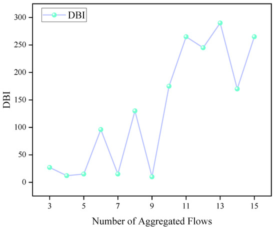 A reasonable number of clustering centers (i.e., aggregated flows) is essential for improving clustering performance. In this study, the Davies–Bouldin Index (DBI) is employed to evaluate clustering quality under different numbers of cluster centers, where a smaller DBI value indicates better clustering performance. As shown in Figure 4, the DBI value increases as the number of aggregated flows increases. The DBI reflects the average of the maximum ratios between intra-cluster distance and inter-cluster distance. If the number of aggregated flows is too small, each cluster will contain too many traffic flows, which may cause network congestion. On the other hand, too many clusters will increase computational overhead. Therefore, the number of aggregated flows is set to 9 in this study, which corresponds to a relatively low DBI value.