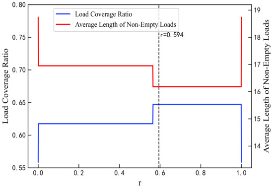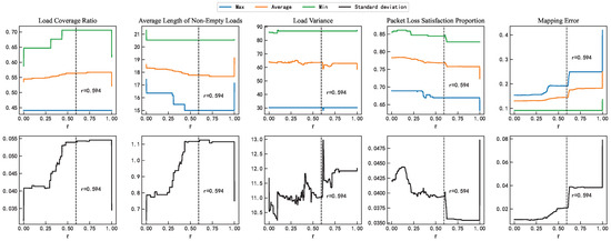 To verify the robustness of the empirically determined value r = 0.594 in terms of performance, this study repeated each possible value of r 100 times. At r = 0.594, in Figure 8, the load coverage ratio and the average length of non-empty loads are located well within the stable range (particularly near the middle of the average values), with the remainder metric positioned at the left end of its stable range, indicating good performance stability. Regarding the variability in performance metrics at r = 0.594, the first two metrics exhibit larger standard deviations—approximately 5.5% and 1.1, respectively—due to the effects of load balancing; the other metrics maintain moderate standard deviations of 11%, 4%, and 0.21, respectively.