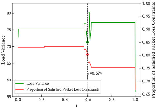 The proportion parameter r for QoS mapping must be predetermined. In this study, an optimal value of r was selected by analyzing the mapping results of the proposed algorithm when . As r increases from 0 to 1 in Figure 5, the residual load weight rises, leading to improvements in load coverage and reductions in average load length, thus enhancing load balance and effectively mitigating network congestion. As shown in Figure 6, the overall load variance decreases, reaching its minimum at except at the boundary values. Packet loss rates decline within the range to , with the rate at maintaining at least 80%. As shown in Figure 7, errors in the GBR/DC-GBR categories increase due to the increase in load balancing weight, whereas the non-GBR errors remain stable, all at relatively low levels when . Taking into account both load balance and error control, the value was ultimately chosen. Furthermore, the mapping success rate remains constant, attributed to the fixed clustering and regional partitioning results, which effectively constrain the impact of variations in r.