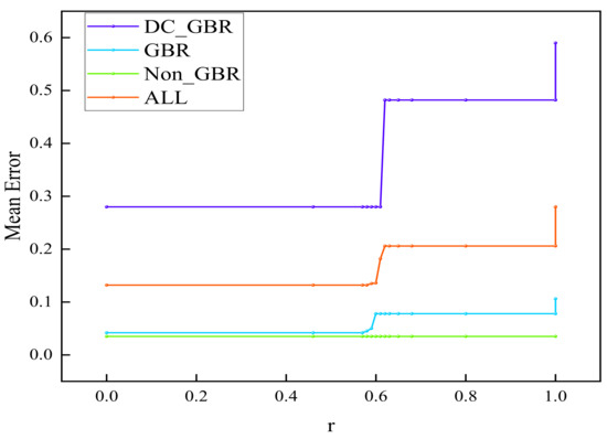 Average mapping error of DC-GBR, GBR, non-GBR, and overall under different values of r.