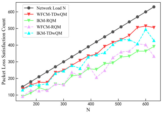 As illustrated in Figure 10, among all four algorithm combinations, WFCM-TDwQM consistently achieves the highest number of flows satisfying the packet loss rate requirement—especially under medium- to high-load conditions—demonstrating its superior performance in both success rate and reliability.