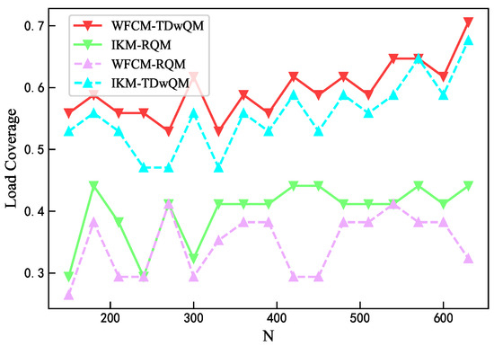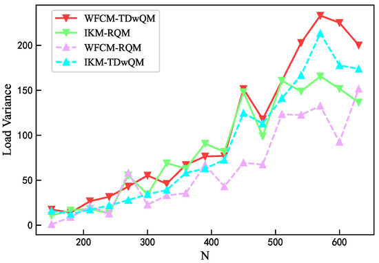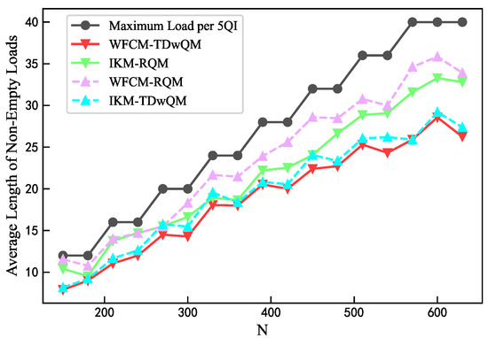 As the network load increases, the load balancing metrics of the four algorithm combinations are analyzed. As shown in Figure 12, WFCM-TDwQM consistently achieves the highest 5QI load coverage ratio, with an average of 59.5%, followed by IKM-TDwQM at 55.5%. The other two methods, IKM-RQM and WFCM-RQM, show significantly lower averages of 40.0% and 34.8%, respectively. As illustrated in Figure 13, the average non-empty load per 5QI increases with the rising network load. Overall, the values follow the order WFCM-RQM > IKM-RQM > IKM-TDwQM > WFCM-TDwQM, indicating that WFCM-TDwQM distributes the load more evenly across multiple 5QIs. According to Figure 14, the load variance across the 5QI set also shows an upward trend as the load increases. In most cases, WFCM-TDwQM exhibits a higher load variance. This is because a greater number of 5QIs are involved in the load balancing process, resulting in a wider but more effective distribution of traffic load.