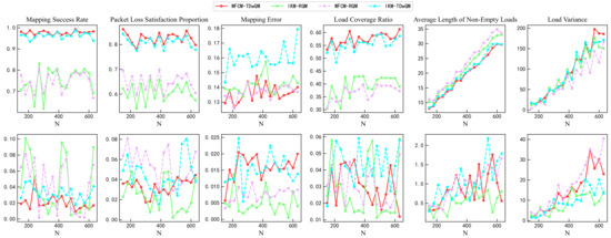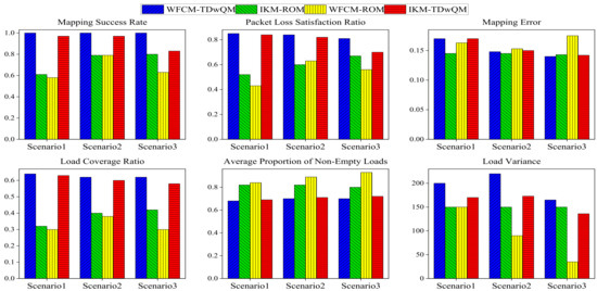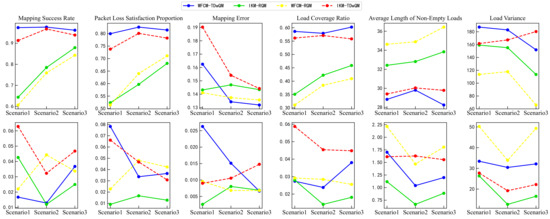 As shown in Figure 16, in the audio–video-oriented Scenario 3, the proposed WFCM-TDwQM algorithm not only ensures QoS consistency between pre- and post-mapping—reflected in its high mapping success rate, high proportion of flows meeting the packet loss constraint, and low mapping error—but also achieves excellent load distribution performance, including high load coverage, a low average proportion of non-empty loads, and a reasonable level of load variance.