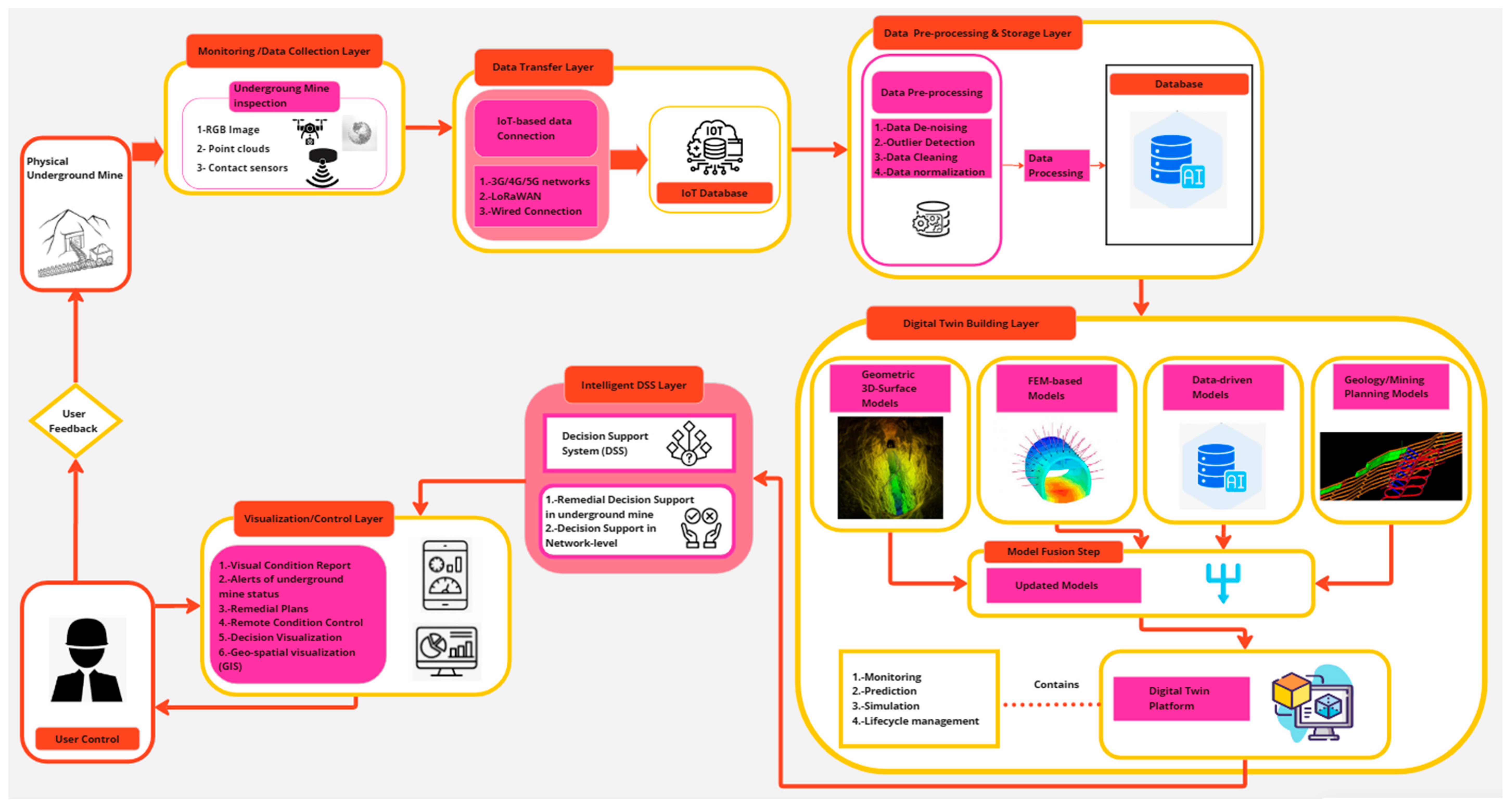 - Real-time data collection: IoT devices, such as environmental, geotechnical, and equipment sensors, collect critical information on variables such as temperature, gas concentration, tunnel stability, and machinery performance. This data is transmitted to the digital twin to reflect the status of underground operations.