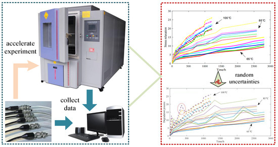 At 100 °C, the degradation intensifies substantially, leading to a much sharper trend compared with the other two cases. Even under this extreme stress level, the estimated curve remains consistent with the empirical observations, indicating that the proposed method is capable of modeling both the rate and the magnitude of degradation. Overall, the figure demonstrates that the estimated model reproduces the observed degradation behavior reliably across different stress levels, thereby validating its applicability for accelerated degradation testing and lifetime prediction.