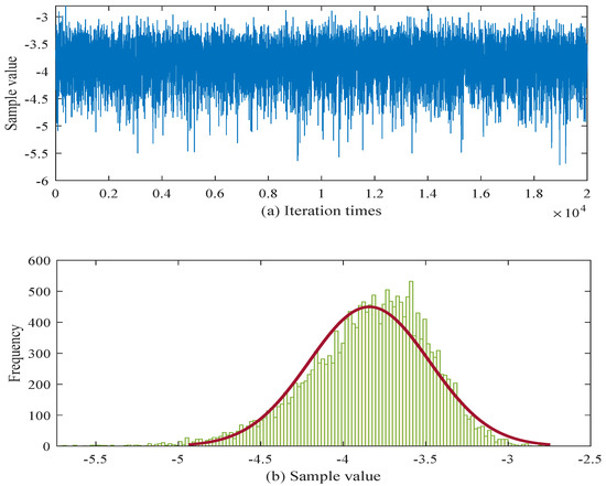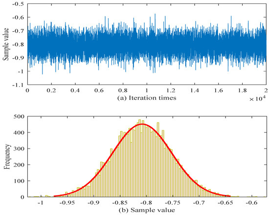 Both figures indicate that, after the 2000-iteration burn-in, the M–H algorithm produces stable chains and unimodal posterior distributions for