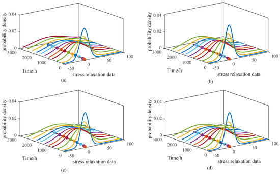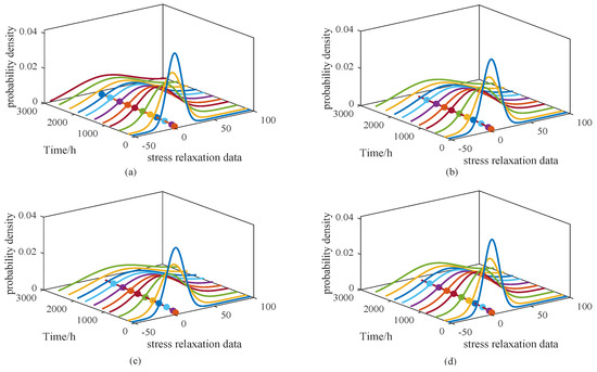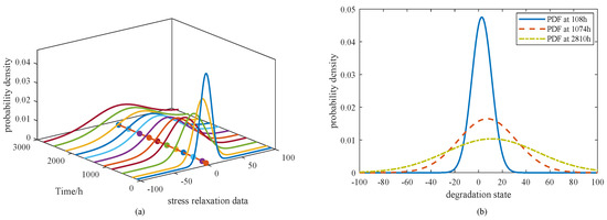 Figure 8a, the probability density functions (PDFs) of the proposed model are shown to closely follow the overall degradation trajectory under the 65 °C stress condition. The degradation trend is effectively captured, and the fitted PDFs provide a clear representation of the probabilistic distribution of degradation states across the time horizon. This demonstrates that the model not only traces the mean degradation path but also quantifies the associated uncertainty through the shape and spread of the PDFs.