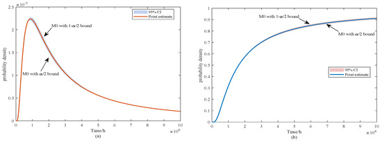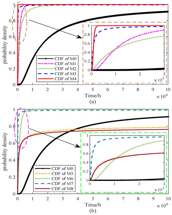 Figure 9a, it is evident that the cumulative distribution functions (CDFs) of models M1–M4 differ noticeably from that of the proposed model M0. Specifically, the CDFs of M3 and M4 rise more steeply, implying shorter predicted lifetimes and smaller variances, while M1 and M2 exhibit relatively flatter curves, indicating longer tails and greater dispersion in the estimated lifetimes. In