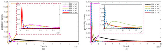 Figure 9b, the comparison of M0 with models M5–M8 underscores the differing stress–parameter mapping assumptions. The CDF curve of M5 is shifted left relative to M8, indicating earlier failure predictions, while M6 and M7 produce narrower distributions, suggesting reduced variability and a tendency to underestimate uncertainty. By contrast, M8 shows the slowest rise, corresponding to the longest predicted lifetime but potentially leading to an overestimation of reliability. Overall, the CDF of M0 does not rise the fastest nor the slowest; instead, it provides a balanced representation across the entire time horizon, supporting its suitability for characterizing lifetime distributions under nominal stress conditions. To further highlight the differences among the models, the PDFs derived from Equation (