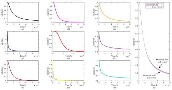 Figure 12 presents the reliability curves of the nine models (M0–M8), where panel (a) and (j) correspond to the proposed method (M0) and its interval performance, respectively, and panels (b)–(i) display the baseline models. For a quantitative comparison, the median lifetime