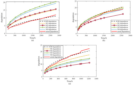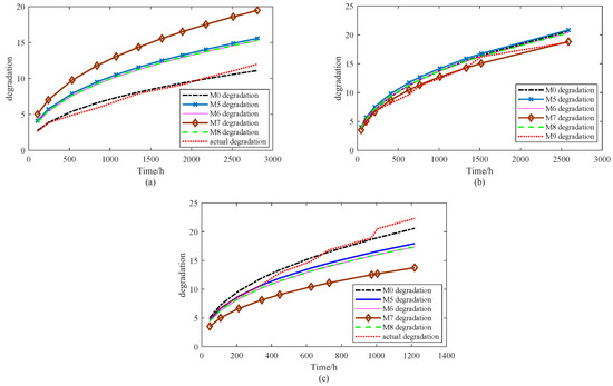 Figure 13, the proposed model M0 delivers the best performance under the 65 °C and 100 °C stress conditions. At 100 °C, models M5, M6, and M8 approximate the observed degradation trajectory reasonably well during the initial 300 h; however, their accuracy declines as time progresses, suggesting that these models fail to adequately capture the underlying uncertainty. Under 85 °C, model M7 exhibits the closest fit to the degradation data, while the remaining models show comparable but slightly weaker performance. Nevertheless, M7 performs poorly at both 65 °C and 100 °C, lagging behind the others and highlighting its limited robustness.