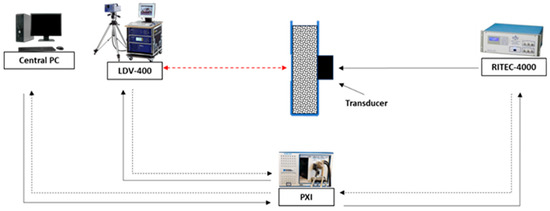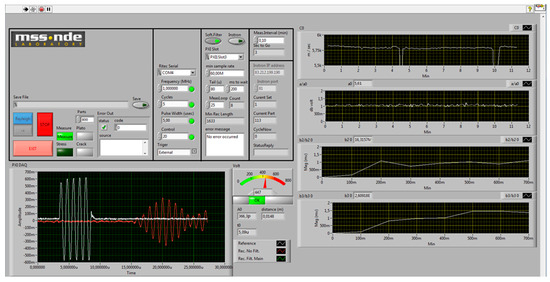 A dedicated LabVIEW-based software suite (Figure 2) was employed to orchestrate the monitoring system and to automate the entire workflow—from excitation parameterization (frequency, number of cycles, amplitude) and synchronized acquisition from the RITEC RPR−4000 pulser/receiver and the LDV, to real-time signal processing, visualization, and data archiving. Communication with the hardware was established through a National Instruments PXIe−1071 chassis comprising the PXIe−8360 for host control, the PXIe−8430/2 for serial communication with the RITEC unit, and the PXIe−5105 oscilloscope for high-speed digitization. Through this integration, centralized configuration of test conditions, live monitoring of responses, and systematic storage of results suitable for both laboratory and field operation were enabled.