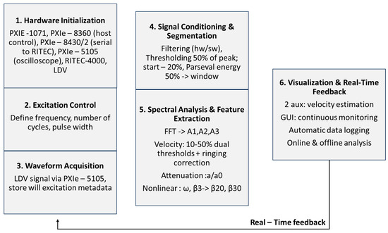 Schematic of the software workflow—from initialization and excitation control through acquisition, conditioning, spectral analysis, velocity and attenuation estimation, nonlinear metrics, and visualization—with a real-time feedback loop enabling fully.