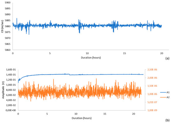 Time-of-flight and spectral amplitudes were processed using the same pipeline employed in the cementitious tests: gated tonebursts were windowed to minimize spectral leakage, FFT magnitudes were corrected for window coherent gain, and arrival times were picked with a dual-threshold method (10%/50%) including ring-down correction. Ultrasonic velocity remained effectively constant throughout the 20 h observation, exhibiting only minor fluctuations coincident with small ambient temperature variations (Figure 4a). After accounting for this weak temperature dependence, the residual velocity variations were consistent with the expected limits set by pick jitter and sampling quantization, and no monotonic trend indicative of instrumental drift was detected.
