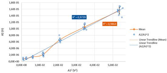 To further characterize the instrumentation, a transmitter-voltage sweep on the steel reference was performed and the deterministic second-harmonic component generated by the measurement chain was quantified. The input voltage to the transmitter was stepped over a controlled range, and at each level ten repetitions were acquired under identical conditions. Individual measurements (blue points) together with the ten-shot average (orange curve) are shown in Figure 5. The second-harmonic amplitude (A2) increased monotonically with drive and exhibited a strong linear relationship with the squared fundamental (A12), with correlation coefficients R2 = 0.9739 for the raw data and R2 = 0.9864 for the averaged series. This behavior is consistent with a weak, but repeatable, quadratic nonlinearity in the transducer–electronics chain.