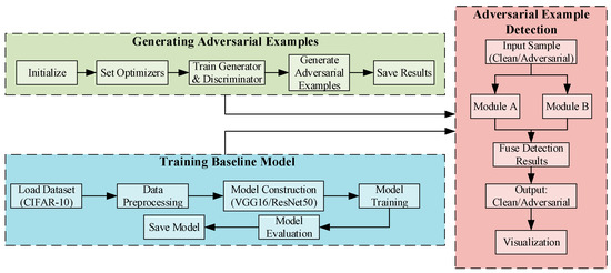 The overall framework of the proposed detection method is illustrated in Figure 1. First, adversarial examples with varying perturbation intensities are generated using the AdvGAN attack. Subsequently, two deep convolutional networks, VGG16 and ResNet50, are trained as baseline classifiers and feature extractors. On this basis, two detection modules are introduced: (A) a prototype similarity-based detection method leveraging spatial statistics, and (B) an anomaly detection method based on multidimensional statistical features and Mahalanobis distance. Finally, Modules A and B are integrated to effectively distinguish clean samples from adversarial ones.