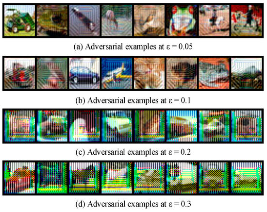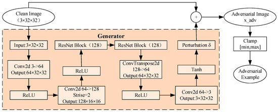 In this study, the CIFAR-10 dataset is adopted as the experimental benchmark. This dataset contains 60,000 32 × 32 pixels color images across 10 categories, with 50,000 images used for training and 10,000 for testing. To construct a comprehensive adversarial detection platform, adversarial examples are first generated based on the AdvGAN framework. The generator architecture and the detailed process of generating adversarial examples are illustrated in Figure 2. By training the generator and discriminator and adjusting the upper limit ε of the perturbation magnitude, four sets of adversarial examples with different attack intensities are constructed (ε ∈ {0.05, 0.1, 0.2, 0.3}). The adversarial example is formulated as shown in Equation (1):