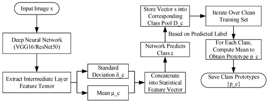 During training, the predicted label of the classifier is used as a reference. For each class c, let the set of statistical features from its training samples be defined as , where denotes the number of samples belonging to class c. The prototype vector of class c is then defined as the mean of all feature vectors in , as shown in Equation (3):