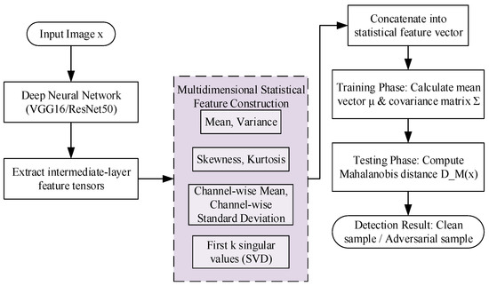 This distance quantifies the degree of deviation of the sample from the overall distribution. A larger indicates a higher likelihood of the sample being an adversarial example. The entire detection process is illustrated in Figure 4.