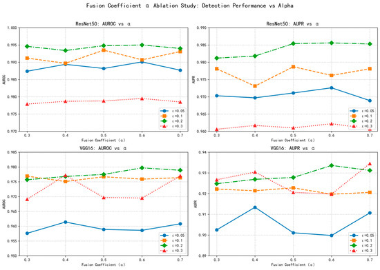 As demonstrated in Figure 5, the fusion coefficient α exhibits remarkable robustness across a wide range of values (0.3 to 0.7). For both ResNet50 and VGG16 architectures, the detection performance (AUROC and AUPR) remains consistently high regardless of the specific α value chosen, with performance variations typically within 1–2% across the tested range. This stability is observed consistently across different perturbation intensities (ε = 0.05 to 0.3), confirming that the fusion mechanism is not sensitive to precise parameter tuning.